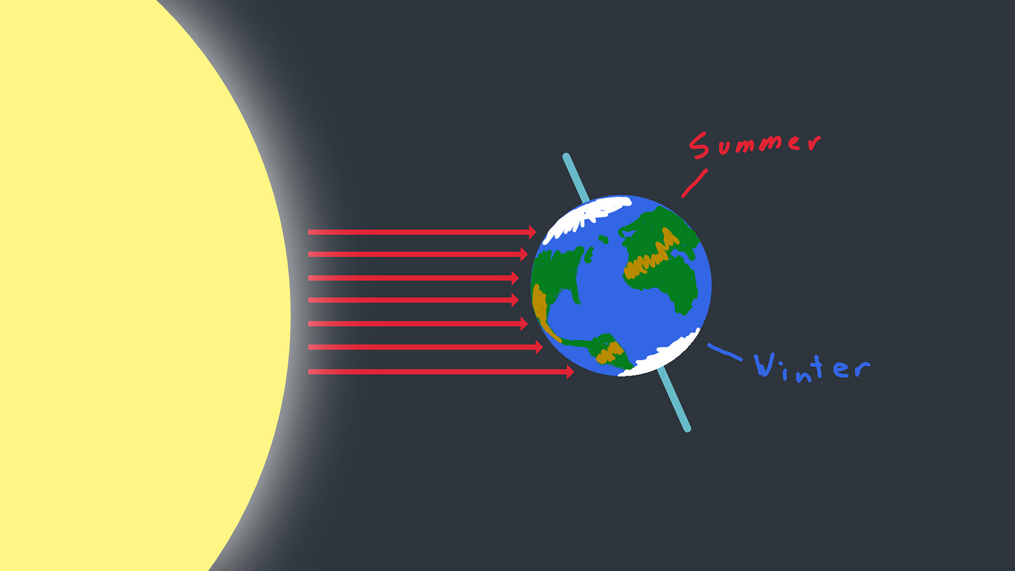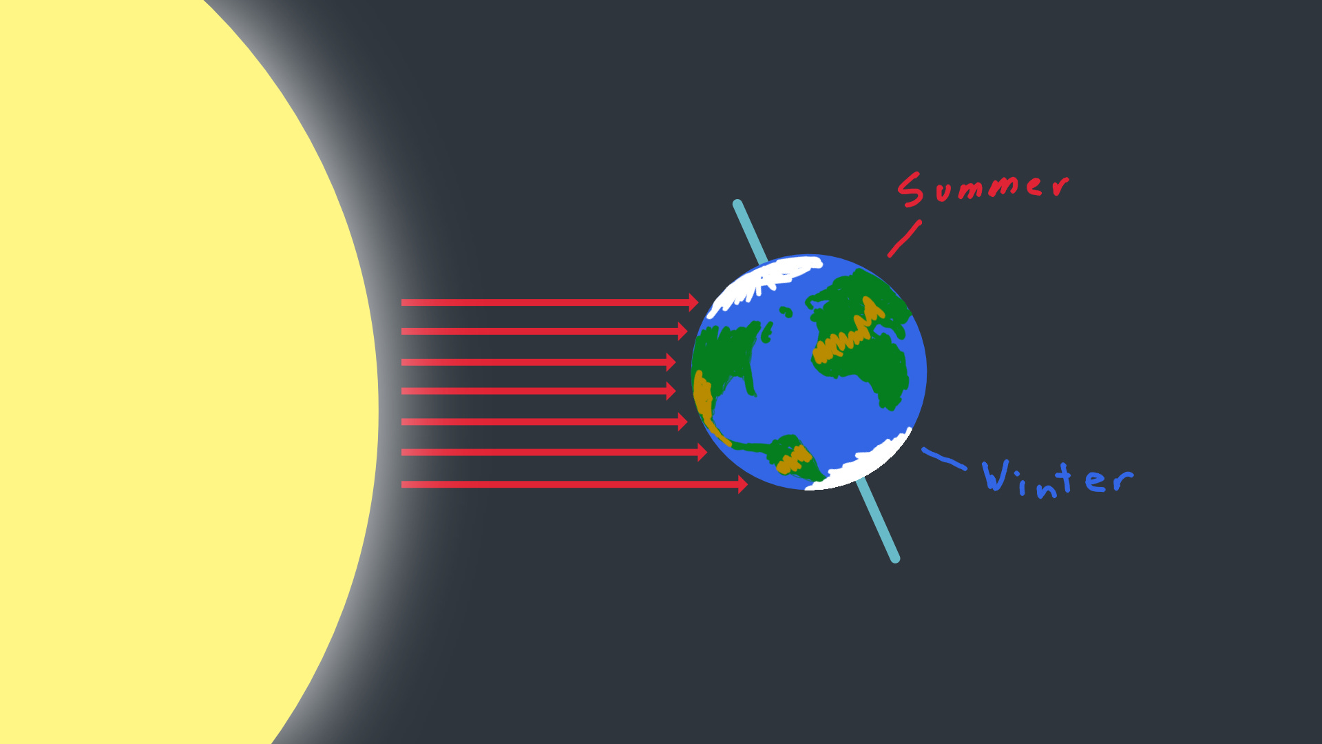 Other people will tell you “because Earth rotates on a tilted axis.” This is the correct answer. The poles of our planet do not align straight up and down perpendicular to our orbit around Sol, but rather lean at 23.5 degrees. This axial tilt means that as Earth is orbiting the sun, first one hemisphere angles more directly towards the sun, and then the other. When a hemisphere is “leaning towards” the sun more directly more energy is concentrated per square meter of surface. More energy = warmth = summer. The hemisphere that is “leaning away” from the sun experiences winter, with solar rays hitting at a shallower angle spreading energy thin. This one geometric fact cascades into basically everything else about how life is experienced on Earth.