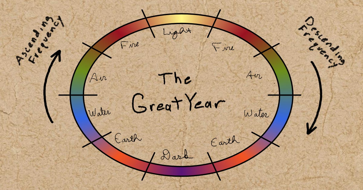Stars in the hexaverse don’t just emit light and heat. They also emit elemental energetic frequencies (extra clay). This looks like an oscillating pattern. They start at the lowest energetic point (Dark), climb to the highest energetic point (Light), and descend back down to where it began. The length of time these oscillations take varies by star. For Zeer’s star, the full cycle takes around 1,010 Zeer days, or a just a smidge under eight and a half solar years. Some Zeeran cultures refer to this as a Great Year.